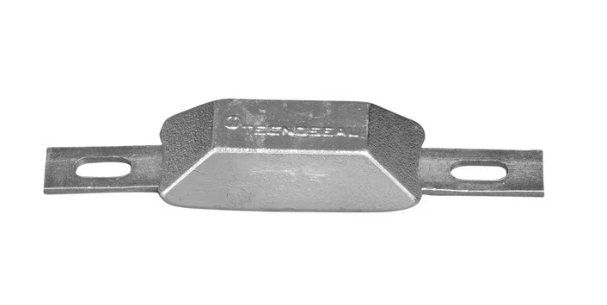 Scandinavian type bolt-on anode zinc 0,5 kg. I: 132mm. L: 95mm. A: 40mm. H: 25mm. Ø: 9x20mm. Strap: 170 x 20 x 3mm.