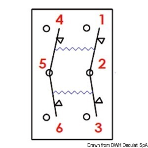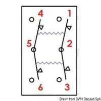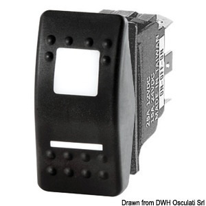 IP56 veekindel lüliti, Marina seeria. Paigaldamiseks on vaja 21,5 x 36,8 mm ristkülikukujulist ava. Maksimaalne võimsus 20 A 12 V juures ja 12 A 24 V juures. Komplektis kahe punase LED-iga: üks sümboli jaoks, mis on alati sisse lülitatud, teine sümboli all oleva spetsiaalse ava jaoks, mis lülitub sisse, kui sümboli indikaator aktiveeritakse. Külgklapp lüliti tuleb tellida eraldi.